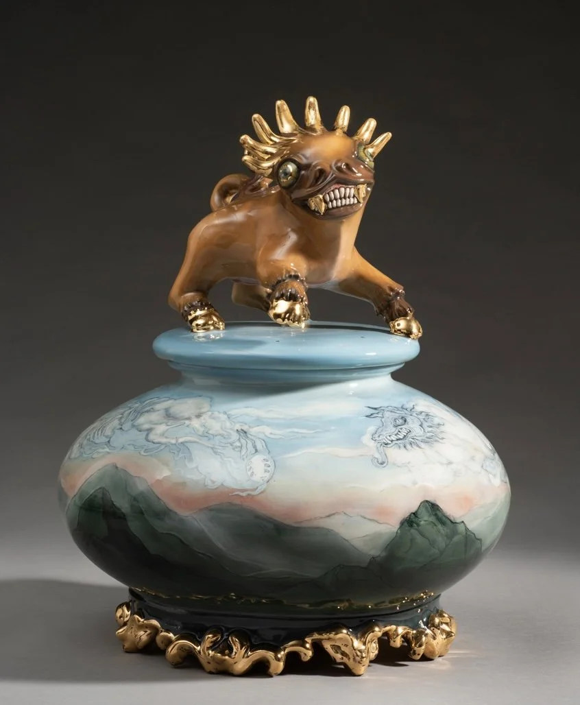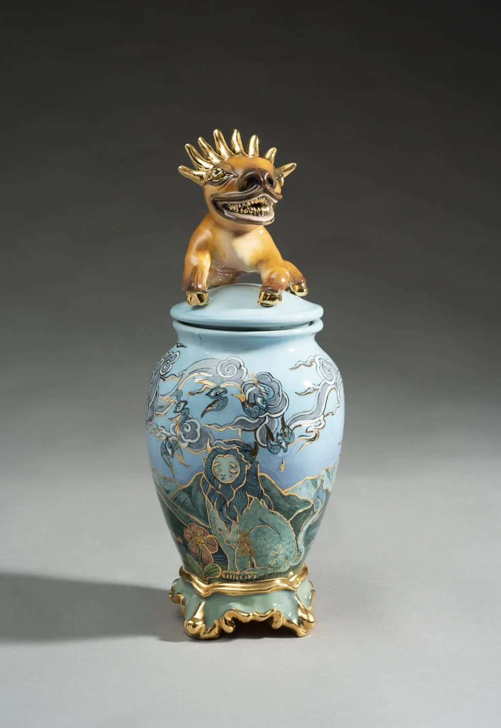 Terracotta, underglaze, glaze, gold lustre 375mm x 300mm x 300mm variable
