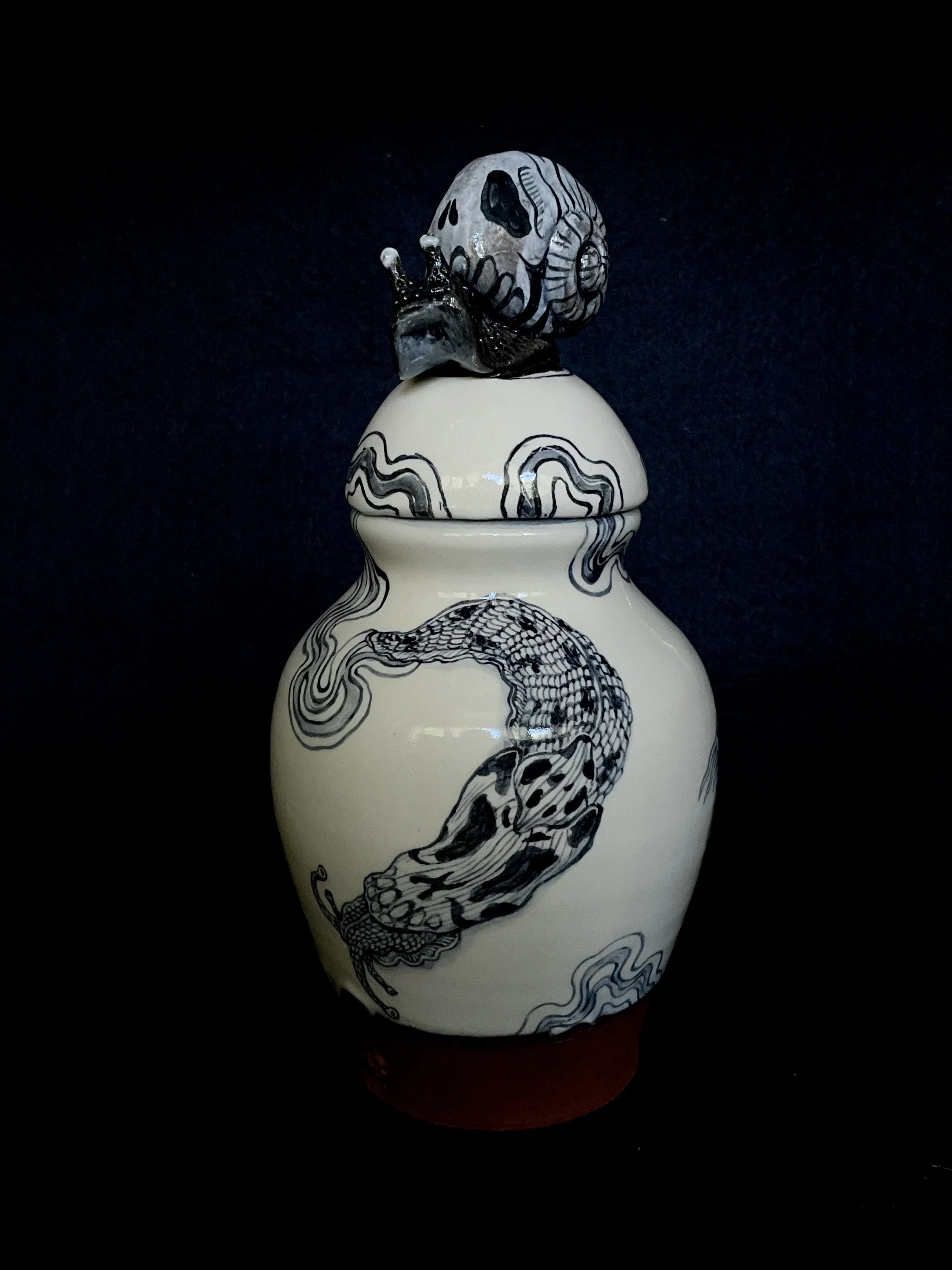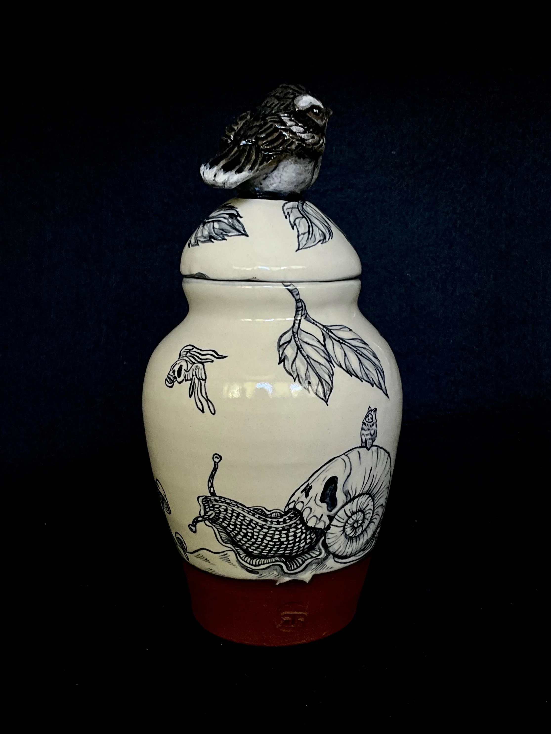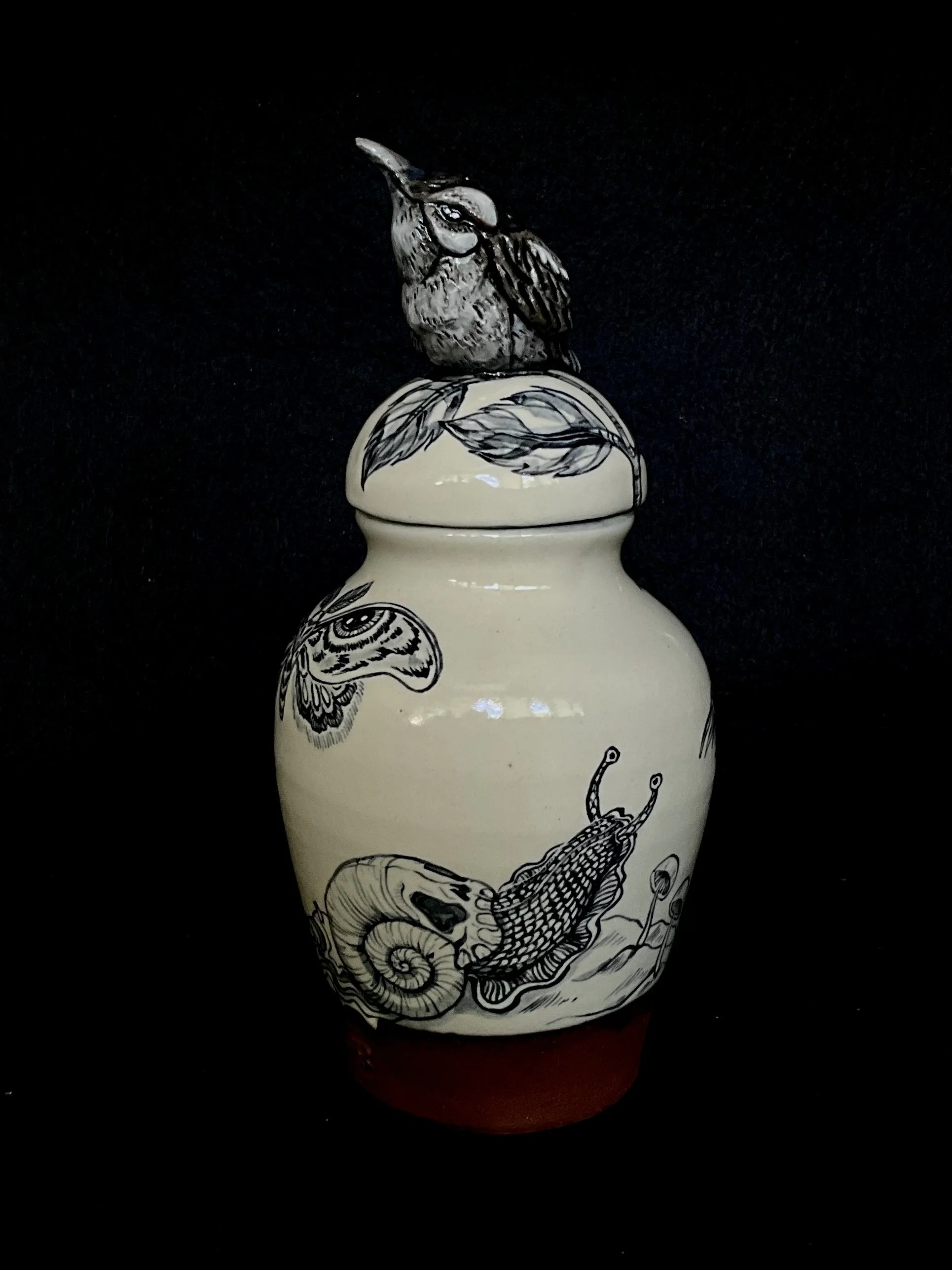 When we returned to Driving Creek, we created a small collection of work inspired by the forest floor around us—Riroriros, snails, slugs, moths, and centipedes. The series includes terracotta blue-and-white urns, bowls, and tumblers shaped by the soft, slow pulse of life and death moving through the forest floor at Driving Creek.