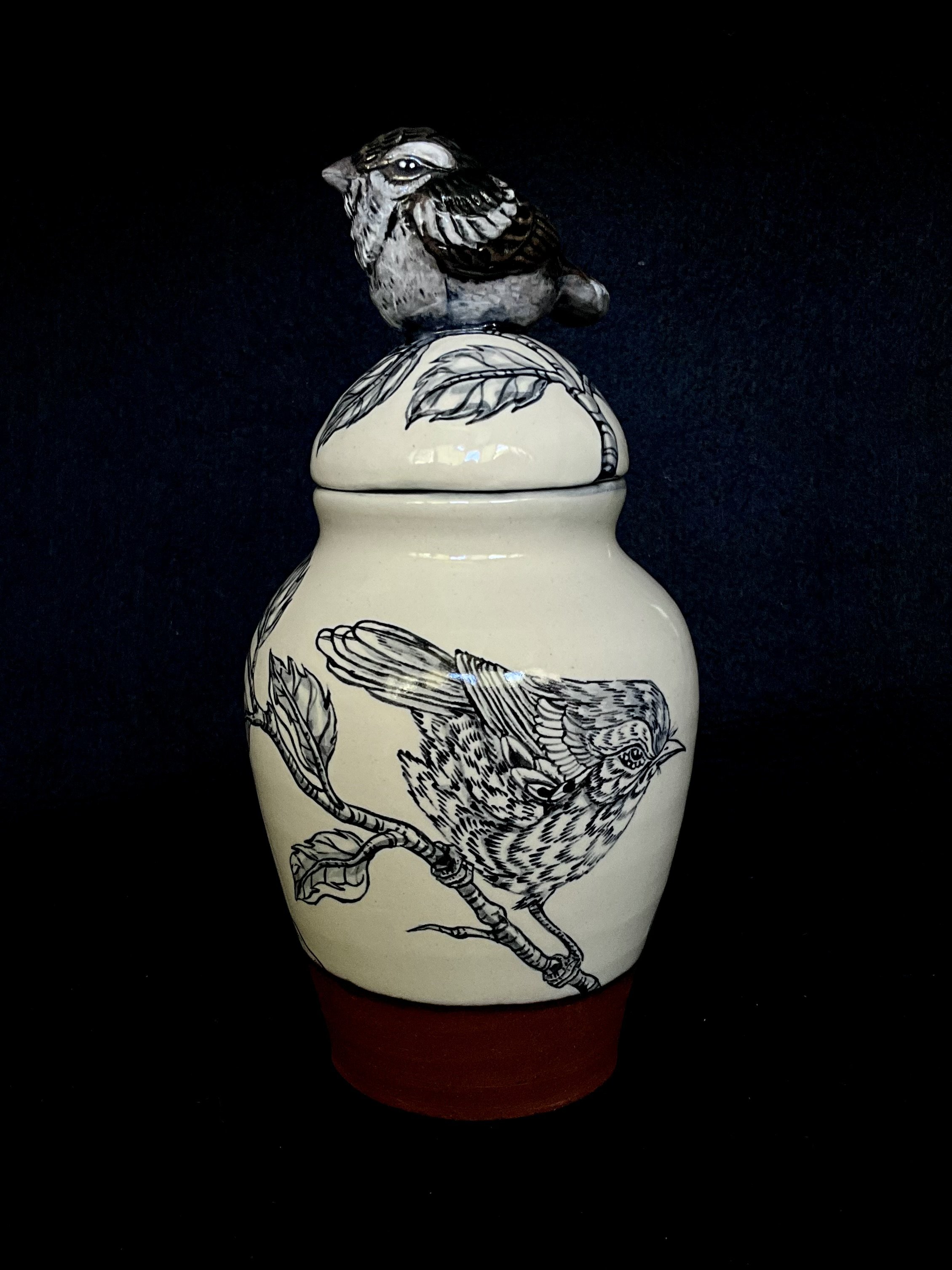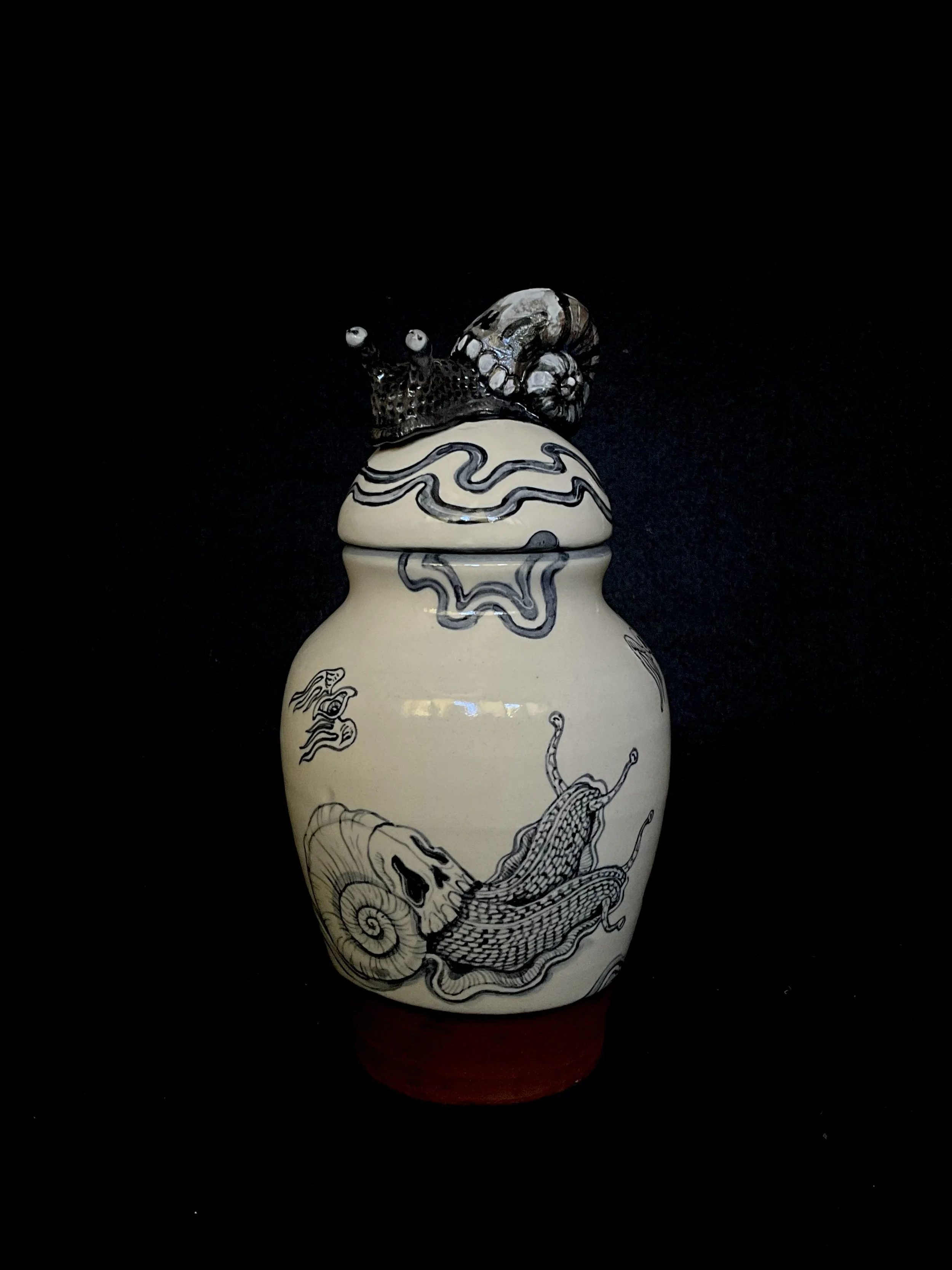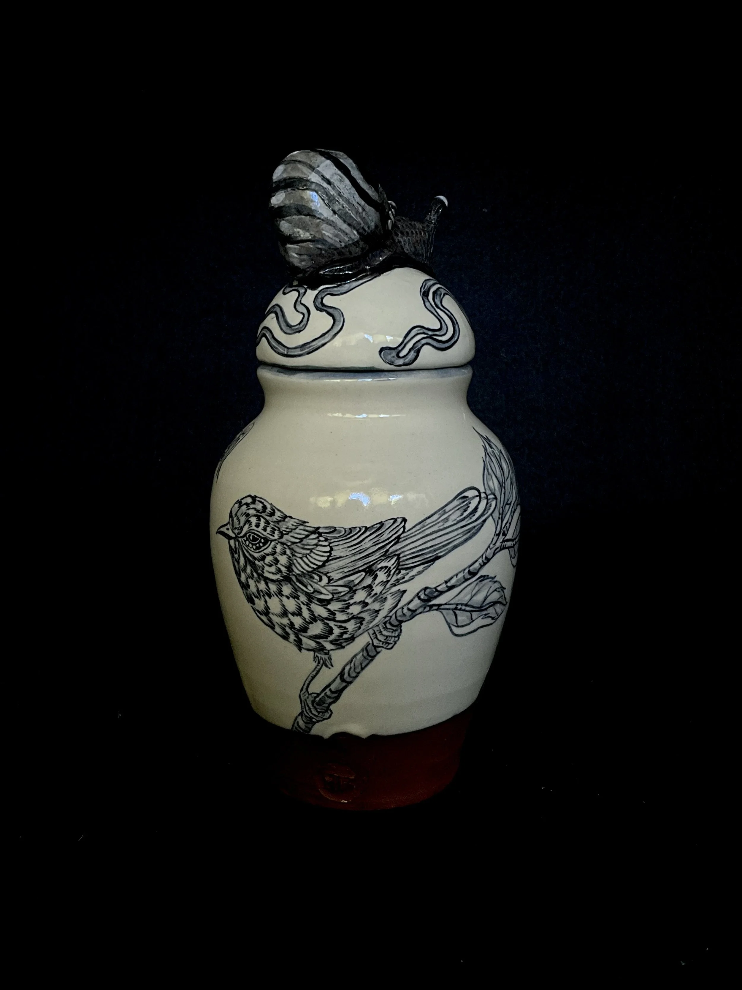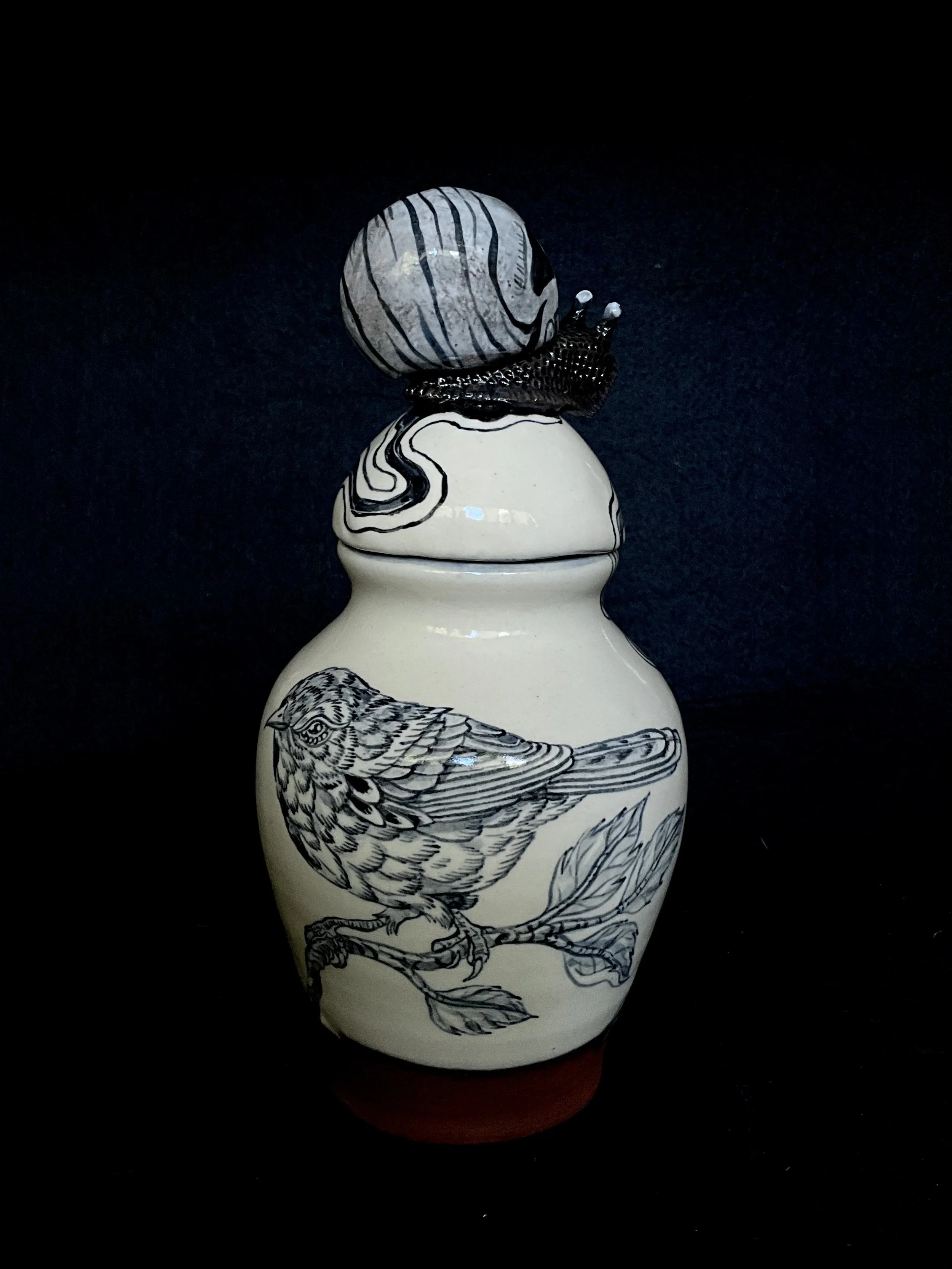When we returned to Driving Creek, we created a small collection of work inspired by the forest floor around us—Riroriros, snails, slugs, moths, and centipedes. The series includes terracotta blue-and-white urns, bowls, and tumblers shaped by the soft, slow pulse of life and death moving through the forest floor at Driving Creek.